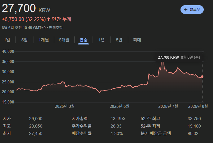 2025년 들어 카카오뱅크의 주가는 1월 초 22,000원대에서 8월 현재 30,000원 선을 돌파하며 약 36% 상승했습니다. 이는 실적 호조와 함께 플랫폼 확장 전략에 대한 시장 기대감이 반영된 결과입니다.
